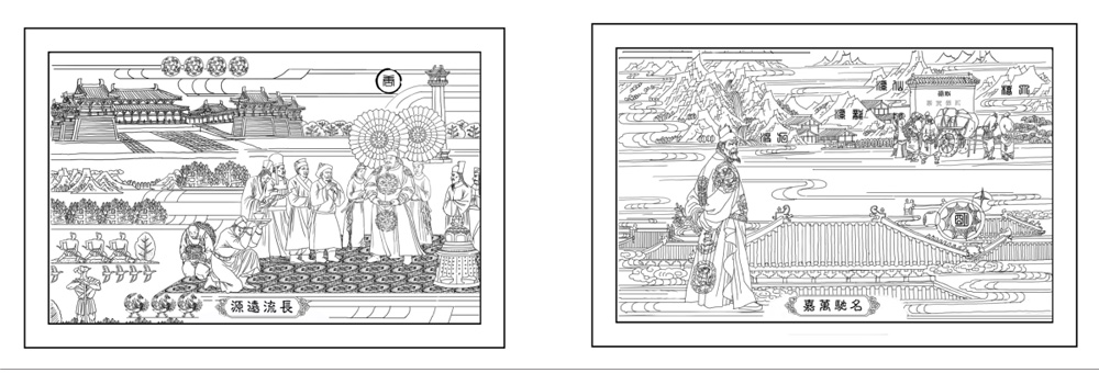 東邊浮雕“源遠(yuǎn)流長”,正中位置供奉中華農(nóng)耕始祖神農(nóng)氏。神農(nóng)氏手捧黍稷,放眼天下。龍鳳拱衛(wèi),云水升騰。海晏河清,天下太平。左側(cè)表現(xiàn)的是茶圣陸羽(733-804)。陸羽,竟陵(今湖北天門)人,3歲時(shí)為竟陵龍蓋寺智識禪師收養(yǎng),19歲開始游歷江南,評水品茶,歷30年而不綴。唐代宗李豫招陸羽進(jìn)宮講茶并賜其供職舍中,陸羽不羨官位榮華,“結(jié)廬苕溪之濱,閉門對書”,寫下了世界上第一部被譽(yù)為“茶葉百科全書”的茶學(xué)專著——《茶經(jīng)》。右側(cè)為茶仙盧仝(約795-835)。盧仝系初唐四杰盧照鄰嫡系子孫,年少聰慧,博覽經(jīng)史,但不喜功名。朝廷曾兩次以周到的禮節(jié)召他為諫議大夫,他都沒有出仕。著作有《茶譜》存世。其所作《七碗茶詩》,傳唱千載。