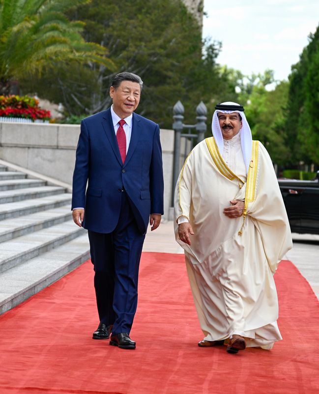 5月31日下午,國(guó)家主席習(xí)近平在北京人民大會(huì)堂同來(lái)華國(guó)事訪問(wèn)并出席中阿合作論壇第十屆部長(zhǎng)級(jí)會(huì)議開(kāi)幕式的巴林國(guó)王哈馬德舉行會(huì)談。這是會(huì)談前,習(xí)近平在人民大會(huì)堂東門(mén)外廣場(chǎng)為哈馬德舉行歡迎儀式。新華社記者 張領(lǐng) 攝