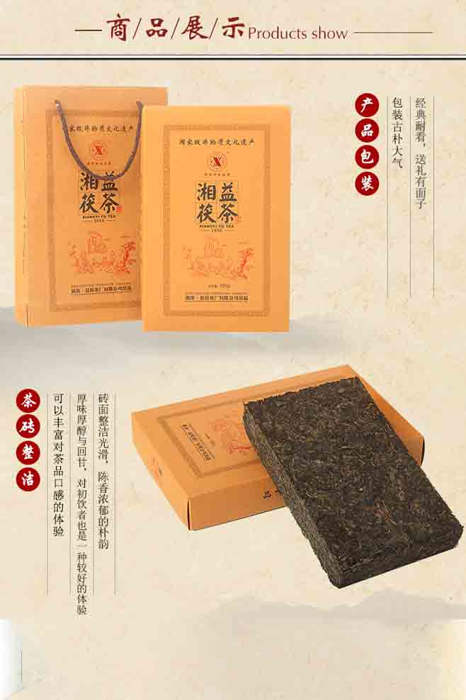??“湘益”茯茶均采用優(yōu)質(zhì)黑毛茶為原料,經(jīng)篩分投入拼配篩制—汽蒸渥堆—壓制定型—發(fā)花—干燥出烘—包裝入庫(kù)等工序精制而成,茶葉金花普茂,湯色紅濃,滋味醇厚,具有明顯的調(diào)節(jié)新陳代謝、降脂降糖功效。